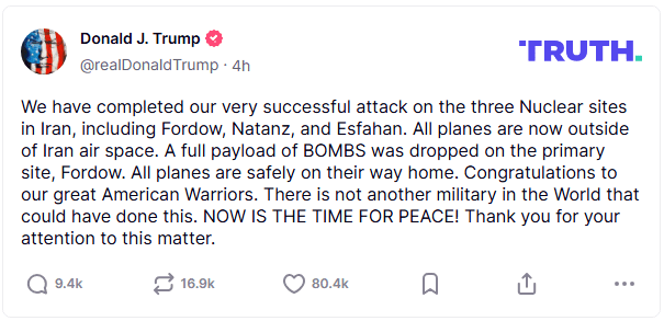 “Concluímos com muito sucesso nosso ataque às três instalações nucleares no Irã, incluindo Fordow, Natanz e Esfahan. Todos os aviões já estão fora do espaço aéreo iraniano”, disse Trump pelas redes sociais. Em seguida, o presidente norte-americano disse que “Fordow se foi”.