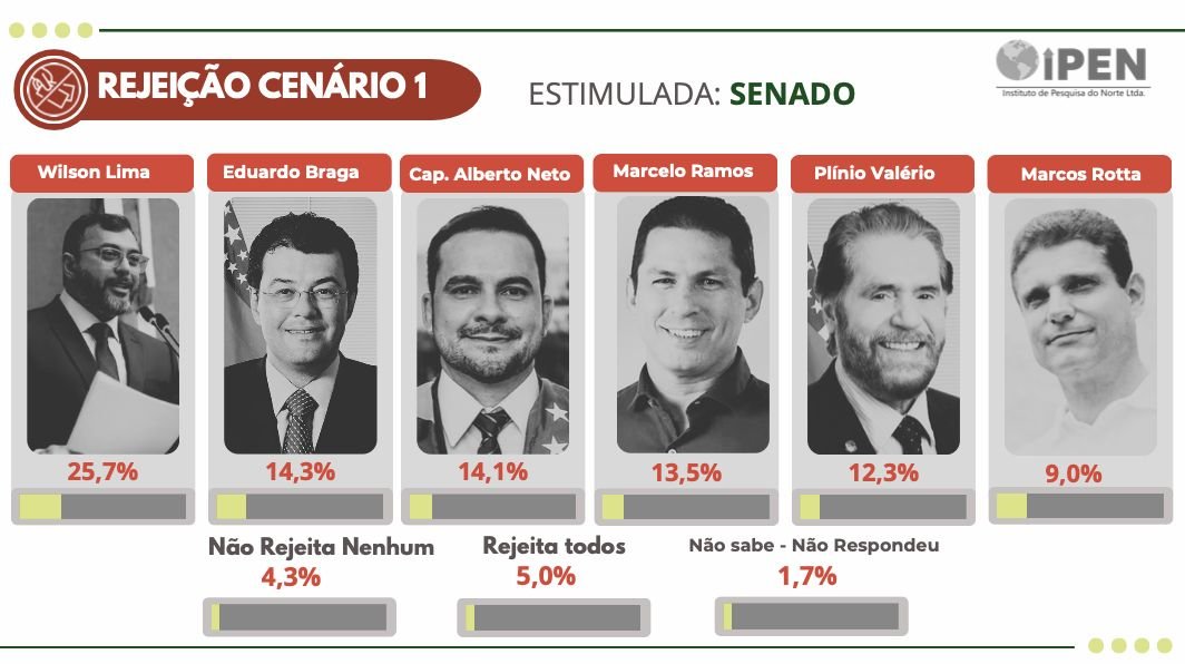 Na rejeição, quando o entrevistado aponta em quem não votaria de jeito nenhum, Wilson Lima aparece na frente, com 25,7%; Mais de 10 pontos atrás vem Eduardo Braga, com 14,3%; Alberto Neto, com 14,1%; Marcelo Ramos tem 13,5%; Plínio Valério, 12,3%; e Marcos Rotta é o menos rejeitado, com 9%.
