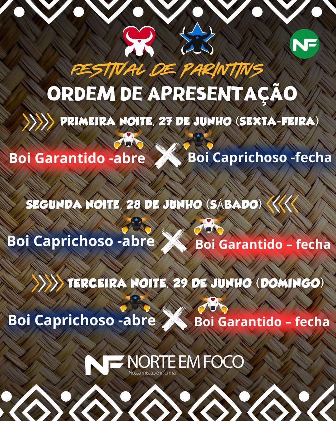 A ordem de apresentação dos bois Caprichoso e Garantido nas três noites do Festival de Parintins 2025 foi definida neste sábado (21), durante sorteio oficial realizado no Bumbódromo. O evento marcou o início da contagem regressiva para a 58ª edição do festival, que será realizada nos dias 27, 28 e 29 de junho.