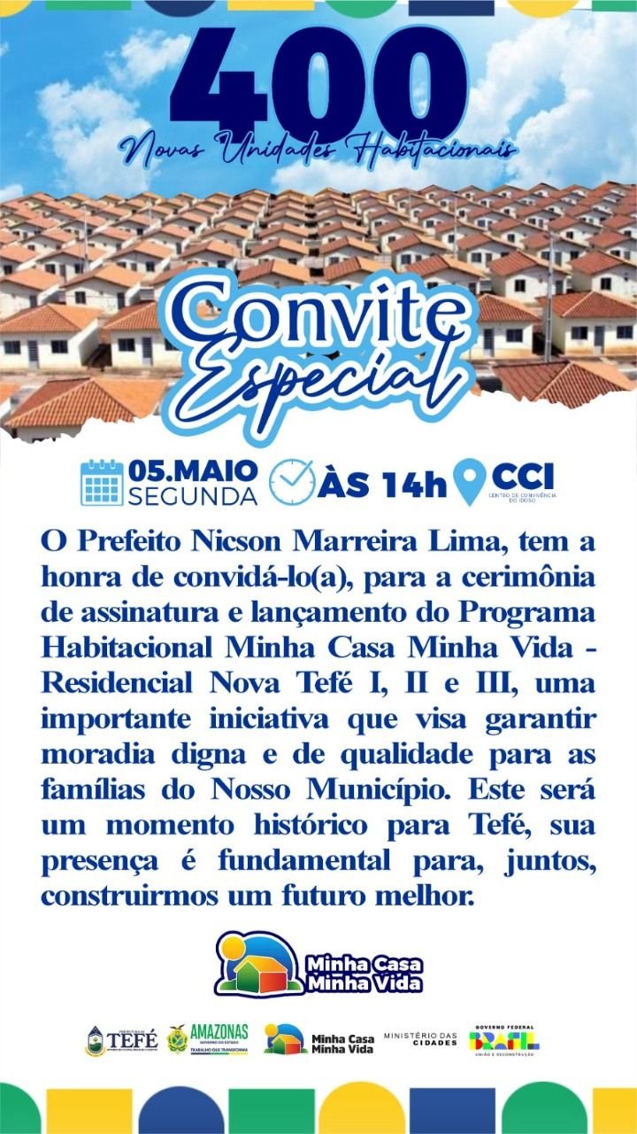 Na próxima segunda-feira, 5 de maio, às 14h, o município de Tefé viverá um marco histórico com o lançamento oficial do Programa Habitacional Minha Casa Minha Vida – Residencial Nova Tefé I, II e III, que prevê a construção de 400 novas unidades habitacionais. O evento acontecerá no Centro de Convivência do Idoso (CCI) e marca o início de um novo ciclo para centenas de famílias tefeenses que sonham com uma moradia digna e de qualidade.