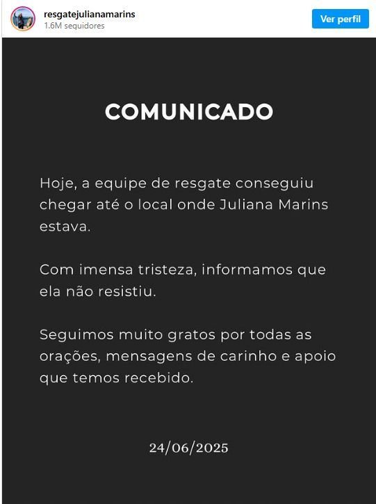 “Hoje, a equipe de resgate conseguiu chegar até o local onde Juliana Marins estava. Com imensa tristeza, informamos que ela não resistiu. Seguimos muito gratos por todas as orações, mensagens de carinho e apoio que temos recebido.”