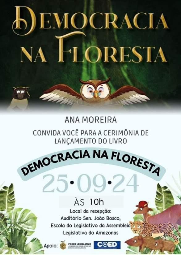 Manaus, AM – No dia 25 de setembro de 2024, às 10h, a escritora Ana Moreira, natural de Itacoatiara, lançará oficialmente seu livro infantil “Democracia na Floresta” no Auditório Senador João Bosco, na Escola do Legislativo da Assembleia Legislativa do Amazonas, localizada na Av. Mário Ypiranga Monteiro, 3950, Parque 10 de Novembro, Manaus.