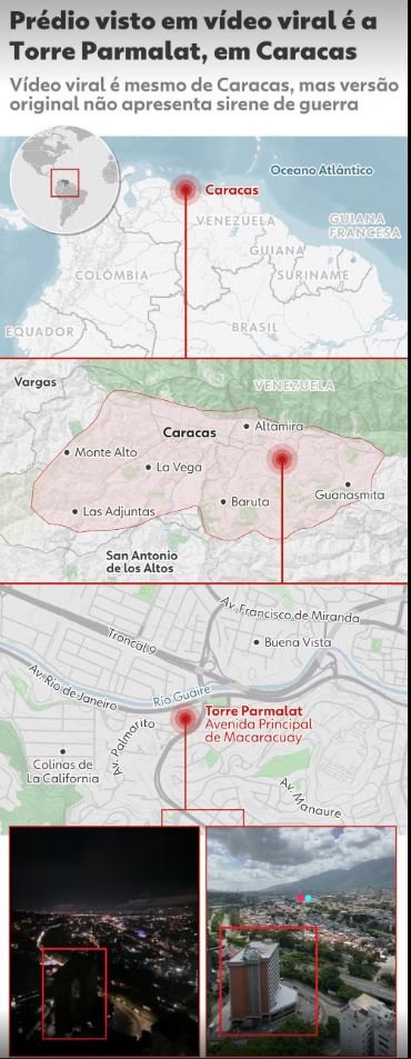 O vídeo mostra uma visão panorâmica e noturna de uma grande da capital venezuelana, ao som de “sirenes de guerra”, para supostamente anunciar o que seria uma ação das Forças americanas. Uma caixa de texto sobreposta às imagens diz: “Caracas, último minuto sirenes de guerra”.