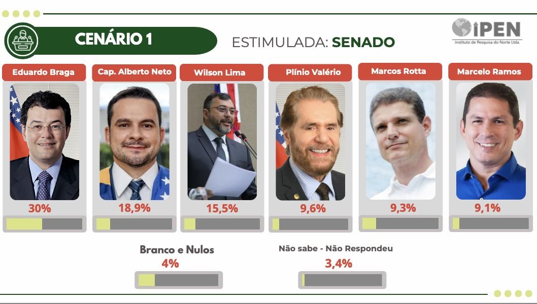 No cenário 1, com todos os candidatos possíveis que já foram citados para a disputa, o senador Eduardo Braga aparece disparado com 30% das intenções de votos na pesquisa estimulada (quando o entrevistado escolhe entre as opções apresentadas); Alberto Neto permanece em segundo, com 18.9%; o governador Wilson Lima aparece em terceiro, com 15,5%.
