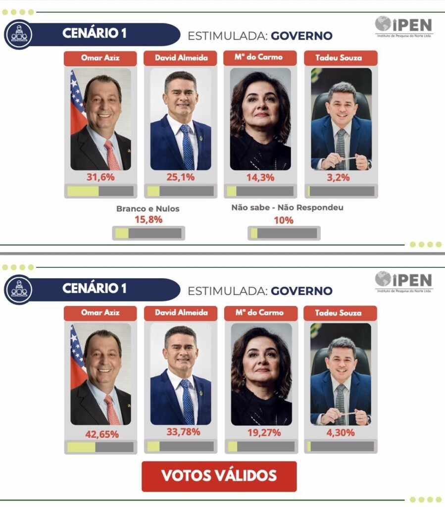 Este é o melhor cenário para Omar Aziz. Sem David Almeida, os votos válidos (não contabilizando os brancos e nulos) chegariam a mais de 60%, o que garantiria a vitória no primeiro turno.