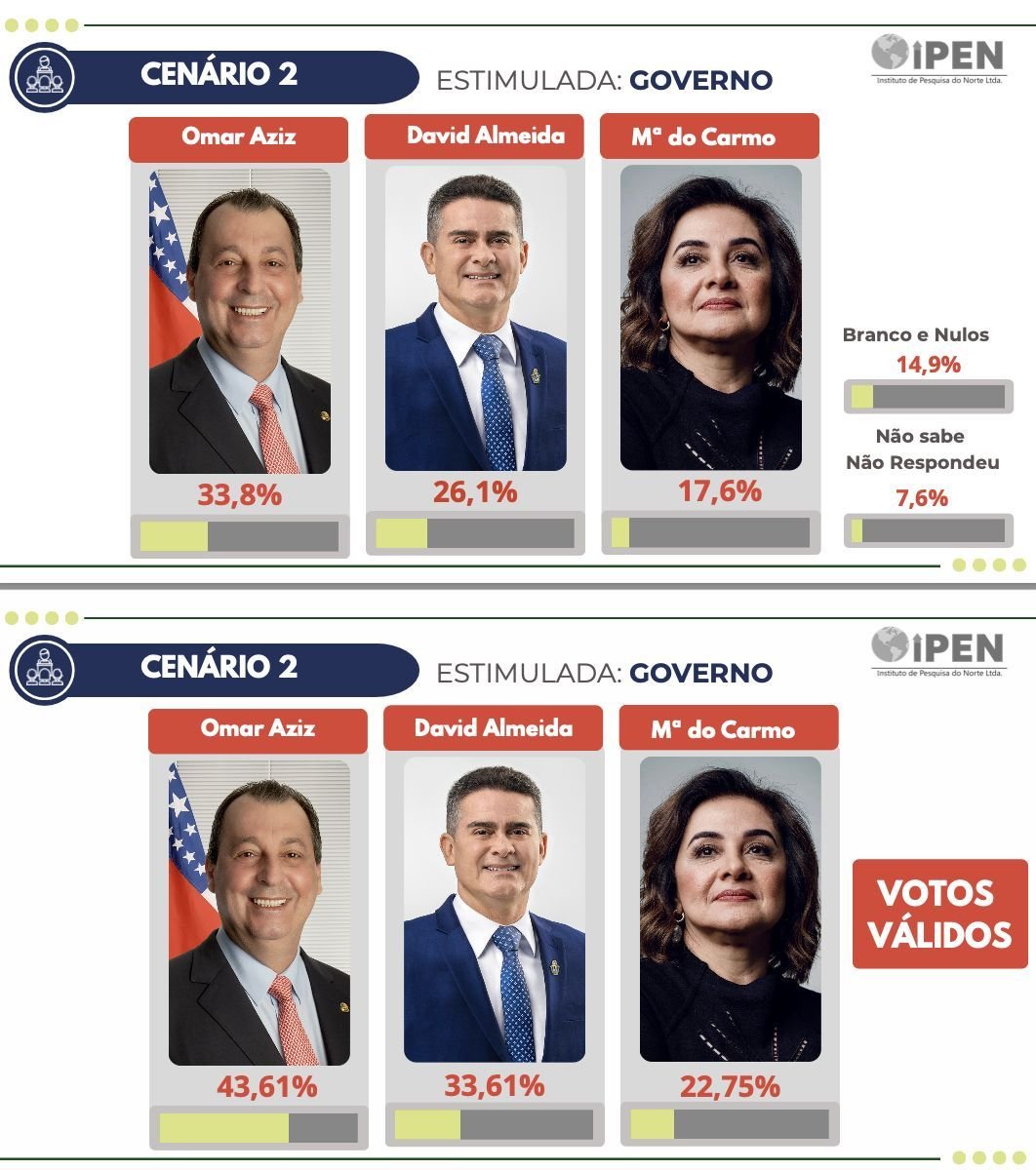 No cenário 2, sem Tadeu, Omar Aziz também parece na primeira posição, com 33,8%; David Almeida repete a segunda posição, chegando a 26,1%; e Maria do Carmo Seffair ainda estaria na terceira colocação, com 22,75%. Brancos e nulos somam 14,9% e 7,6% não sabem ou não quiseram responder.