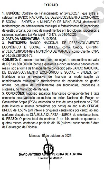 Manaus, AM – A Prefeitura de Manaus formalizou um novo financiamento de R$ 145,8 milhões com o Banco Nacional de Desenvolvimento (BNDES), destinado à modernização da administração municipal por meio de tecnologia e sistemas digitais. A operação foi autorizada pela Lei Municipal nº 3.479/2025 e registrada no Diário Oficial. A justificativa oficial é fortalecer a capacidade de gestão urbana e modernizar serviços administrativos.
