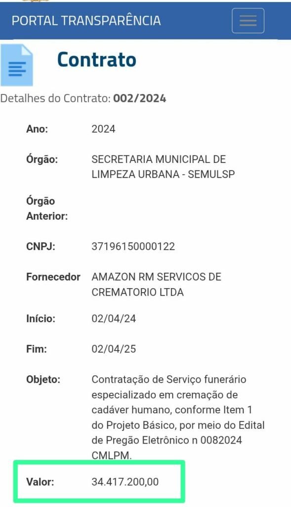 Os dois contratos milionários finalizaram seu período de 12 meses de vigência, sem aditivo exposto no portal da transparência para a continuade dos serviços, mas na prática a empresa contratada continua realizando as cremações públicas humana e pet através das solicitações da Semulsp.