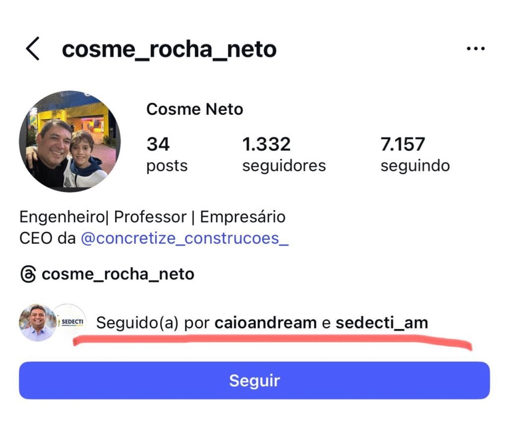 O Núcleo Investigativo do Portal Alex Braga (PAB), buscou por mais informações sobre o empresário e nas redes sociais Caio André e Cosme Rocha Neto seguem um ao outro, o que aumenta a especulação de uma aliança entre os dois.