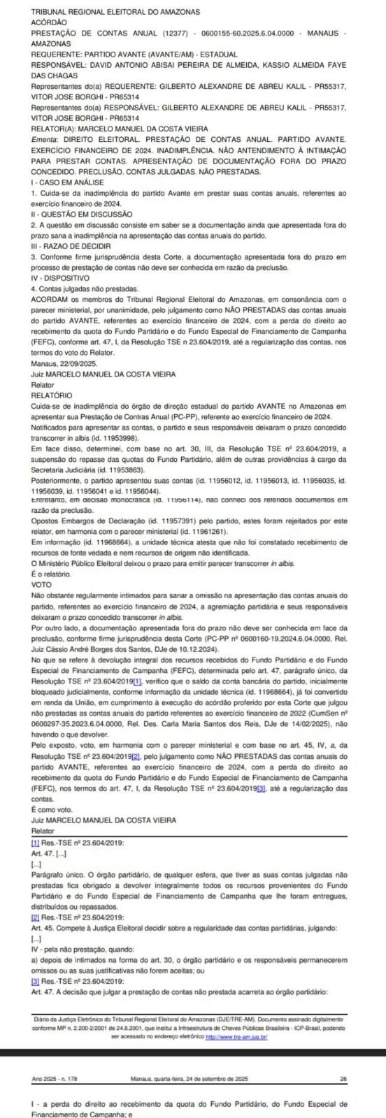A relatoria do caso foi do juiz Marcelo Manuel da Costa Vieira, que seguiu parecer do Ministério Público Eleitoral. De acordo com o acórdão, a agremiação, presidida no estado pelo prefeito de Manaus, David Almeida, foi regularmente intimada, mas não protocolou a documentação exigida dentro do prazo estipulado.