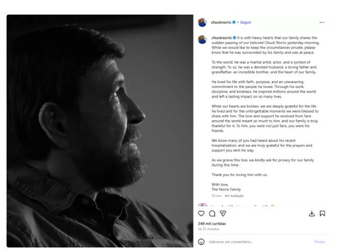 “É com o coração pesado que a nossa família compartilha o falecimento repentino do nosso querido Chuck Norris ontem de manhã. Embora gostaríamos de manter as circunstâncias privadas, por favor saibam que ele estava rodeado pela família e estava em paz.