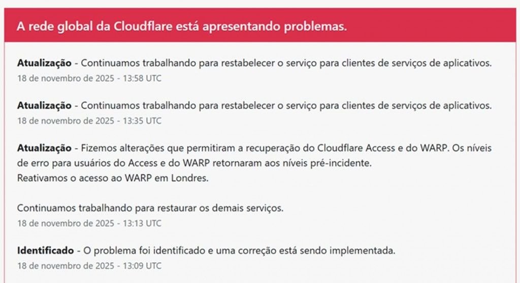 Em sua página de status, a Cloudflare confirmou o incidente e trabalhou para restabelecer os serviços:
